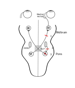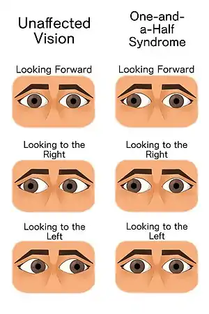 The one and a half syndrome is a rare weakness in eye movement affecting both eyes, in which one cannot move laterally at all, and the other can move only in outward direction. More formally, it is characterized by "a conjugate horizontal gaze palsy in one direction and an internuclear ophthalmoplegia in the other".[1][2] Nystagmus is also present when the eye on the opposite side of the lesion is abducted. Convergence is classically spared as cranial nerve III (oculomotor nerve) and its nucleus is spared bilaterally.