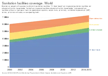 Sanitation facilities coverage worldwide from 2000 to 2015 (the orange line is the data for open defecation).[1]