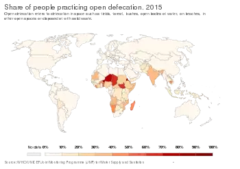 Open defecation is the human practice of defecating outside ("in the open") rather than into a toilet. People may choose fields, bushes, forests, ditches, streets, canals, or other open spaces for defecation. They do so either because they do not have a toilet readily accessible or due to traditional cultural practices.[2] The practice is common where sanitation infrastructure and services are not available. Even if toilets are available, behavior change efforts may still be needed to promote the use of toilets. 'Open defecation free' (ODF) is a term used to describe communities that have shifted to using toilets instead of open defecation. This can happen, for example, after community-led total sanitation programs have been implemented.