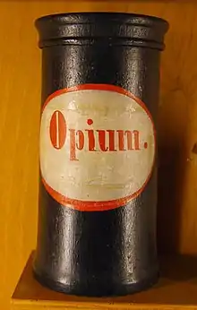 The Persian physician Abū ‘Alī al-Husayn ibn Sina ("Avicenna") described opium as the most powerful of the stupefacients, in comparison to mandrake and other highly effective herbs, in The Canon of Medicine. The text lists medicinal effects of opium, such as analgesia, hypnosis, antitussive effects, gastrointestinal effects, cognitive effects, respiratory depression, neuromuscular disturbances, and sexual dysfunction. It also refers to opium's potential as a poison. Avicenna describes several methods of delivery and recommendations for doses of the drug.[24] This classic text was translated into Latin in 1175 and later into many other languages and remained authoritative until the 19th century.[25] Şerafeddin Sabuncuoğlu used opium in the 14th-century Ottoman Empire to treat migraine headaches, sciatica, and other painful ailments.[26]