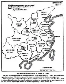 Official Chinese resistance to opium was renewed on September 20, 1906, with an antiopium initiative intended to eliminate the drug problem within 10 years. The program relied on the turning of public sentiment against opium, with mass meetings at which opium paraphernalia were publicly burned, as well as coercive legal action and the granting of police powers to organizations such as the Fujian Anti-Opium Society. Smokers were required to register for licenses for gradually reducing rations of the drug. Action against opium farmers centered upon a highly repressive incarnation of law enforcement in which rural populations had their property destroyed, their land confiscated and/or were publicly tortured, humiliated and executed.[74] Addicts sometimes turned to missionaries for treatment for their addiction, though many associated these foreigners with the drug trade. The program was counted as a substantial success, with a cessation of direct British opium exports to China (but not Hong Kong)[75] and most provinces declared free of opium production. Nonetheless, the success of the program was only temporary, with opium use rapidly increasing during the disorder following the death of Yuan Shikai in 1916.[76] Opium farming also increased, peaking in 1930 when the League of Nations singled China out as the primary source of illicit opium in East and Southeast Asia. Many[77] local powerholders facilitated the trade during this period to finance conflicts over territory and political campaigns. In some areas food crops were eradicated to make way for opium, contributing to famines in Kweichow and Shensi Provinces between 1921 and 1923, and food deficits in other provinces.
