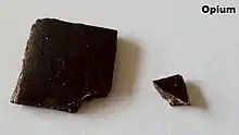Opium (or poppy tears, scientific name: Lachryma papaveris) is dried latex obtained from the seed capsules of the opium poppy Papaver somniferum.[4] Approximately 12 percent of opium is made up of the analgesic alkaloid morphine, which is processed chemically to produce heroin and other synthetic opioids for medicinal use and for the illegal drug trade. The latex also contains the closely related opiates codeine and thebaine, and non-analgesic alkaloids such as papaverine and noscapine. The traditional, labor-intensive method of obtaining the latex is to scratch ("score") the immature seed pods (fruits) by hand; the latex leaks out and dries to a sticky yellowish residue that is later scraped off and dehydrated. The word meconium (derived from the Greek for "opium-like", but now used to refer to newborn stools) historically referred to related, weaker preparations made from other parts of the opium poppy or different species of poppies.[5]