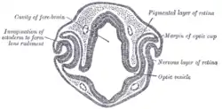 During embryonic development of the eye, the outer wall of the bulb of the optic vesicles becomes thickened and invaginated, and the bulb is thus converted into a cup, the optic cup (or ophthalmic cup), consisting of two strata of cells. These two strata are continuous with each other at the cup margin, which ultimately overlaps the front of the lens and reaches as far forward as the future aperture of the pupil.