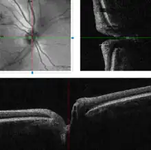 ![]() Ophthalmoscopy photograph showing the optic disc as a bright area on the right where blood vessels converge. | |
