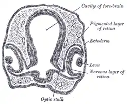 The optic vesicles project toward the sides of the head, and the peripheral part of each expands to form a hollow bulb, while the proximal part remains narrow and constitutes the optic stalk.[1][2]