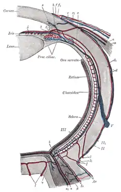 ![]() Diagram of the blood vessels of the eye, as seen in a horizontal section. | |