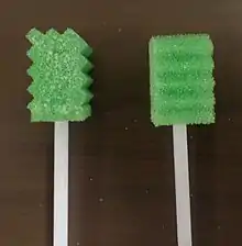 Oral care swabs are disposable, single-use oral care sponges attached to a stick. They are used for oral care in the hospital and long-term care setting.[1] Disposable oral care swabs may also be known by other various names, such as sponge swab,[2] swabs for oral care,[2] foam swab,[3] mouth swab,[4] oral swabstick, and the trademark name Toothette.
