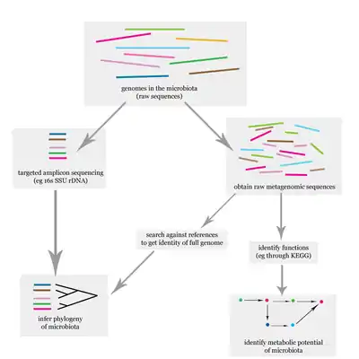 The problem of elucidating the human microbiome is essentially identifying the members of a microbial community, which includes bacteria, eukaryotes, and viruses.[18] This is done primarily using deoxyribonucleic acid (DNA)-based studies, though ribonucleic acid (RNA), protein and metabolite based studies are also performed.[18][19] DNA-based microbiome studies typically can be categorized as either targeted amplicon studies or, more recently, shotgun metagenomic studies. The former focuses on specific known marker genes and is primarily informative taxonomically, while the latter is an entire metagenomic approach which can also be used to study the functional potential of the community.[18] One of the challenges that is present in human microbiome studies, but not in other metagenomic studies, is to avoid including the host DNA in the study.[20]