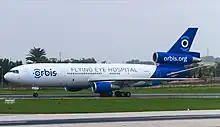 Orbis is well known for its "Flying Eye Hospital", an ophthalmic hospital and teaching facility located on board a DC-10 aircraft. The Flying Eye Hospital brings training to doctors and nurses in developing countries with little access to professional development and training. Classrooms, operating theatres and laser rooms are aboard the plane and the local medical personnel are able to watch live surgeries as well as simulations.[13] 3D filming and broadcast facilities allow the local ophthalmic professionals to observe the live surgeries through the eyes of the surgeon.[8] Surgeries can also be broadcast to additional classes outside of the aircraft, be it a local hospital or halfway across the world. Participants can ask questions via a two-way audio-visual system.[14] Volunteer pilots donate their time and skills to fly the hospital to the various program sites.