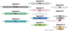 These viruses have double-stranded RNA genomes, so are classified as Class III viruses. Their genome is linear and is segmented into 10 segments of various lengths. One copy of each gene segment is packaged per virion. In most cases, each gene segment encodes a single open reading frame (ORF). The genome encodes seven major structural proteins (VP1–VP7) and three major nonstructural proteins (NS1–NS3). Exceptions to the one gene–one protein rule are segment 9 (Seg-9) and segment 10 (Seg-10), both of which encode two nearly identical proteins initiated from in-phase AUG codons close together near the upstream termini (VP6 and VP6a encoded by Seg-9: NS3 and NS3a encoded by Seg-10).
