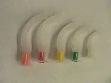 An oropharyngeal airway (also known as an oral airway, OPA or Guedel pattern airway) is a medical device called an airway adjunct used in airway management to maintain or open a patient's airway. It does this by preventing the tongue from covering the epiglottis, which could prevent the person from breathing. When a person becomes unconscious, the muscles in their jaw relax and allow the tongue to obstruct the airway.[1]