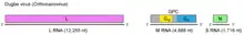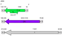 Nairovirus genomes are negative sense, single-stranded RNA. The complete genome is about 17,100–22,800 nucleotides long, and is divided into three segments: large, medium, and small.[2] The large segment is about 11000–14400 nucleotides long (11–14.4 kb), and it encodes the viral polymerase.[1][3] The medium segment is about 4,400–6,300 nucleotides long (4.4–6.3 kb), and it encodes for glycoproteins G¬n and Gc.[1][3] The small segment is about 1,700–2,100 nucleotides long (1.7–2.1 kb), and it encodes the nucleocapsid protein.[2]<[1][3]
