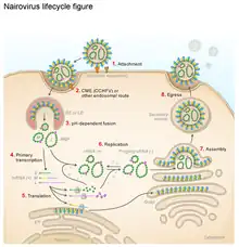 Nairoviruses attach to the host receptor by their Gn-Gc glycoprotein dimer.[3] The virus is then endocytosed into the host cell via a vesicle. The ribonucleocapsid segments are released into the cytoplasm, commencing transcription.[3] Transcription and replication occur within the cell, and the newly synthesized virions are released by budding.