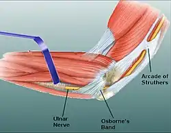 One of the possible sites of ulnar nerve entrapment is the cubital tunnel which is where Osborne's ligament is located.[15] When Osborne's ligament is present, the volume of the cubital tunnel decreases when the elbow is flexed.[16] This contributes to chronic compression of the ulnar nerve which causes numbness and weakness in the fingers and can lead to intrinsic paralysis of the hand in untreated severe cases.[17][18] Decompression of the ulnar nerve can be achieved through surgery.[19] Alternatively, in mild cases of the entrapment, non-operative conservative treatment, which includes nerve gliding and wearing a splint at night, may be used to alleviate the nerve compression.[20]