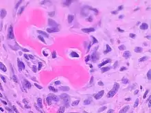 Microscopically: The characteristic feature of osteosarcoma is presence of osteoid (bone formation) within the tumor. Tumor cells are very pleomorphic (anaplastic), some are giant, numerous atypical mitoses. These cells produce osteoid describing irregular trabeculae (amorphous, eosinophilic/pink) with or without central calcification (hematoxylinophilic/blue, granular)—tumor bone. Tumor cells are included in the osteoid matrix. Depending on the features of the tumor cells present (whether they resemble bone cells, cartilage cells, or fibroblast cells), the tumor can be subclassified. Osteosarcomas may exhibit multinucleated osteoclast-like giant cells.[22]
