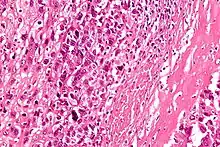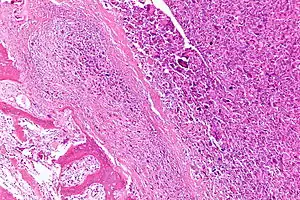 | Intermediate-magnification micrograph of an osteosarcoma (center and right of image) adjacent to non-malignant bone (left-bottom of image): The top-right of the image has poorly differentiated tumor. Osteoid with a high density of malignant cells is seen between the non-malignant bone and poorly differentiated tumor (H&E stain). | |