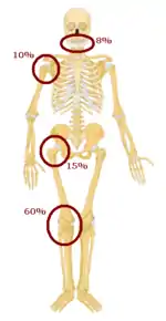 The most commonly affected bones are the proximal humerus, the distal radius, the distal femur, and the tibia,[36] following the basic premise "far from the elbow, close to the knee". Other sites include the ribs, the mandible, the spine, and the pelvis. Rarely, osteosarcoma may arise from soft tissues (extraskeletal osteosarcoma). Metastasis of tumors involving the limb bones is very common, usually to the lungs. The tumor causes a great deal of pain, and can even lead to fracture of the affected bone. As with human osteosarcoma, bone biopsy is the definitive method to reach a final diagnosis. Osteosarcoma should be differentiated from other bone tumours and a range of other lesions, such as osteomyelitis. Differential diagnosis of the osteosarcoma of the skull in particular includes, among others, chondrosarcoma and the multilobular tumour of bone.[37][38]