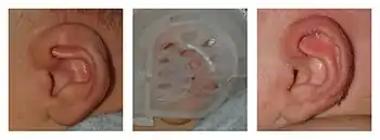 Otoplasty (Greek: οὖς, oûs, "ear" + πλάσσειν, plássein, "to shape") denotes the surgical and non-surgical procedures for correcting the deformities and defects of the pinna (external ear), and for reconstructing a defective, or deformed, or absent external ear, consequent to congenital conditions (e.g. microtia, anotia, etc.) and trauma (blunt, penetrating, or blast).[1] The otoplastic surgeon corrects the defect or deformity by creating an external ear that is of natural proportions, contour, and appearance, usually achieved by the reshaping, the moving, and the augmenting of the cartilaginous support framework of the pinna. Moreover, the occurrence of congenital ear deformities occasionally overlaps with other medical conditions (e.g. Treacher Collins syndrome and hemifacial microsomia).
