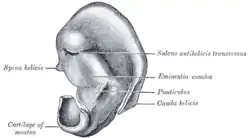 The cauda helicis (tail of the helix) is bound to the fibrofatty tissues of the earlobe by a network of connective tissue. The tail of the helix (cauda helicis), which projects outwards from the concha, carries the earlobe with it, causing it to protrude, which physical condition contributes to prominence of the lower pole of the pinna, the external ear.