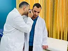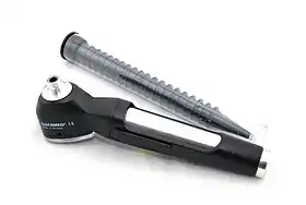 An otoscope or auriscope is a medical device which is used to look into the ears.[1] Health care providers use otoscopes to screen for illness during regular check-ups and also to investigate ear symptoms. An otoscope potentially gives a view of the ear canal and tympanic membrane or eardrum. Because the eardrum is the border separating the external ear canal from the middle ear, its characteristics can be indicative of various diseases of the middle ear space. The presence of earwax (cerumen), shed skin, pus, canal skin edema, foreign body, and various ear diseases can obscure any view of the eardrum and thus severely compromise the value of otoscopy done with a common otoscope, but confirm the presence of obstructing symptoms.