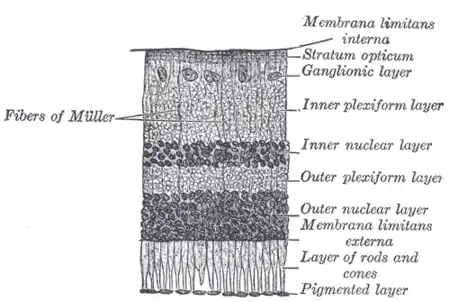 ![]() Section of retina. (Outer plexiform layer labeled at right, sixth from the top.) | |
