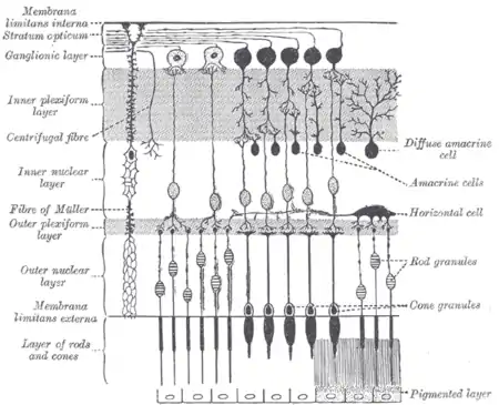 ![]() Plan of retinal neurons. (Outer plexiform layer labeled at left, fourth from the bottom.) | |