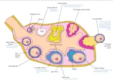 The outer layer is the ovarian cortex, consisting of ovarian follicles and stroma in between them. Included in the follicles are the cumulus oophorus, membrana granulosa (and the granulosa cells inside it), corona radiata, zona pellucida, and primary oocyte. Theca of follicle, antrum and liquor folliculi are also contained in the follicle. Also in the cortex is the corpus luteum derived from the follicles. The innermost layer is the ovarian medulla.[8] It can be hard to distinguish between the cortex and medulla, but follicles are usually not found in the medulla.