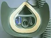 Silicone and rubber oxygen masks are heavier than plastic masks. They are designed to provide a good seal for long-duration use by aviators, medical research subjects, and hyperbaric chamber and other patients who require administration of pure oxygen, such as carbon monoxide poisoning and decompression sickness victims. Dr. Arthur H. Bulbulian pioneered the first modern viable oxygen mask, worn by World War II pilots and used by hospitals.[2] Valves inside these tight-fitting masks control the flow of gases into and out of the masks, so that rebreathing of exhaled gas is minimised.