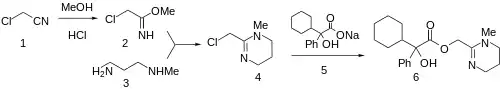The reaction of chloroacetonitrile (1) with methanol and hydrogen chloride leads to the corresponding iminoether (Pinner reaction). Condensation of 2 with 3-methylaminopropylamine gives (3) gives the corresponding tetrahydropyrimidine (4). Displacement of the halogen with the sodium salt 5 affords oxyphencyclimine (6).