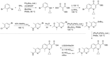 Ozenoxacin is synthesized by the Pd-catalyzed cross-coupling of a bromoquinolone and a pyridyl tributylstannane (Stille coupling).[9][10]