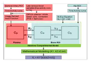 The measurement of Ki from dynamic PET scans require tracer kinetic modelling to obtain the model parameters describing the biological processes in bone, as described by Hawkins et al.[22] Since this model has two tissue compartments, it is sometimes called a two-tissue compartmental model. Various different versions of this model exist; however, the most fundamental approach is considered here with two tissue compartments and four tracer-exchange parameters. The whole kinetic modelling process using Hawkins model can be summed up in a single image as seen on the right-hand-side. The following differential equations are solved to obtain the rate constants: