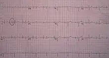 An ECG in a person with a single-chamber pacemaker to the atrium. Note the circle around one of the sharp electrical spikes in the position where the P wave would be expected.