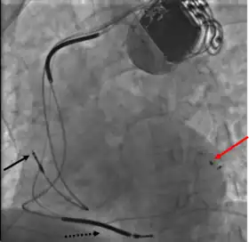 Three leads can be seen in this example of a cardiac resynchronization device: a right atrial lead (solid black arrow), a right ventricular lead (dashed black arrow), and a coronary sinus lead (red arrow). The coronary sinus lead wraps around the outside of the left ventricle, enabling pacing of the left ventricle. Note that the right ventricular lead in this case has two thickened aspects that represent conduction coils and that the generator is larger than typical pacemaker generators, demonstrating that this device is both a pacemaker and a cardioverter-defibrillator, capable of delivering electrical shocks for dangerously fast abnormal ventricular rhythms.