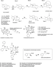 Taxol is a tetracyclic diterpene, and the biosynthesis of diterpenes starts with an FPP molecule being elongated by the addition of an IPP molecule in order to form geranylgeranyl diphosphate (GGPP).[39] The biosynthesis of Taxol contains nineteen steps.[40] These 19 steps can be considered in several steps, with the first step being the formation of the taxane skeleton, which then undergoes a series of oxygenations. Following the oxygenations, two acetylations and a benzoylation occur on the intermediate. The oxygenation of the taxane core is believed to occur on C5 and C10, C2 and C9, C13 followed by C7, and a C1 hydroxylation later on in the pathway. Later in the pathway, an oxidation at C9 forms a ketone functional group and an oxetane, forming the intermediate baccatin III. The final steps of the pathway include the formation of a C13-side chain which is attached to baccatin III.[41] The biosynthesis of Taxol is illustrated in more detail in the figure, with steps 1-7 all occurring in the enzyme taxadiene synthase (TS on the figure). Taxol's biosynthesis begins with E,E,E-GGPP losing pyrophosphate via an SN1 mechanism (step 1 in the figure). The double-bond attacks the cation via electrophilic addition, yielding a tertiary cation and creating the first ring closure (step 2). Another electrophilic attack occurs, further cyclizing the structure by creating the first 6-membered ring and creating another tertiary cation (step 3). An intramolecular proton transfer occurs, attacking the verticillyl cation (step 4) and creating a double bond, yielding a tertiary cation. An electrophilic cyclization occurs in step 5, and an intramolecular proton transfer attacks the taxenyl cation (step 6). This forms the fused ring structure intermediate known as taxadiene. Taxadiene then undergoes a series of 10 oxidations via NADPH, forming the intermediate taxadiene-5α-acetoxy-10β-ol (multiple steps later in the figure). A series of hydroxylations and esterficiations occur, forming the intermediate 10-deacetyl-baccatin III, which undergoes a further series of esterifications and a side-chain hydroxylation.[39] This finally yields the product taxol.
