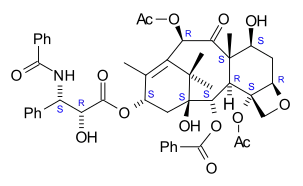 The nomenclature for paclitaxel is structured on a tetracyclic 17-atom skeleton. There are a total of 11 stereocenters. The active stereoisomer is (−)-paclitaxel (shown here).