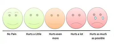 | Child | Wong-Baker Faces Pain Rating Scale – Revised;[14] Coloured Analogue Scale[15] | FLACC (Face Legs Arms Cry Consolability Scale); CHEOPS (Children's Hospital of Eastern Ontario Pain Scale)[16] | Comfort |