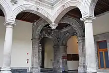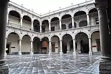 After the end of the Inquisition, in 1838, it was put up for sale by public auction, but no one offered the minimum price. It was finally purchased by the archbishopric.[1] Later it served as lottery offices, a primary school and a military barracks.[3] In 1854, it was sold to the School of Medicine, which at the time was offering classes in professors' homes. After the purchase, a number of changes were made, and a boarding school created here.[1] Eventually, it would become the school of medicine and nursing of the National University (today's UNAM)[3] In 1873, in despair over an unrequited love, romantic poet Manuel Acuña committed suicide by poison in a room here.[1] In 1879, after modification, the old chapel became the Academy of Medicine and a third floor was added, which resulted in the removal of the crest which held the coat-of-arms of the Inquisition.[1]