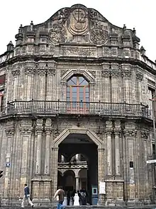 From nearly the beginning of the colonial period until the Mexican War of Independence, this spot has been the headquarters of the Inquisition in the colony of New Spain.[2][3] While the Tribunal of the Holy Inquisition was not fully established here until 1571, the first cleric with inquisitorial duties was Martin de Valencia, who came to the colony in 1524. The Dominicans, in whom the papacy had invested Inquisition duties, arrived in 1526 and proceeded to build a monastery in the area occupied by both the current palace and the Church of Santo Domingo. The first official Inquisitor for the colony, Pedro Moya de Contreras, worked in the section of the monastery, where the palace would be built in the 18th century.[2]