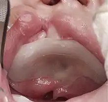 A palatal plate is a prosthetic device, generally consisting of an acrylic plate and retention clasps of orthodontic wire, which covers a fistula of the palate. It may be used to aid in improving articulation and feeding. The blockage of the opening helps improve hypernasality and suckling ability for babies. In the case of a labial-oral-nasal fistula, the plate may include an anterior upward extension to fully occlude the passageway running between the labial surface of the alveolus, alveolus, and nasal cavity. The plate may be constructed to include any congenitally missing teeth to improve articulation and appearance. Individuals who use palatal plates must be monitored periodically by their dental professionals due to possible tissue irritation by the plate. Materials such as food particles, oral mucosa and secretions may cause buildup on the upper surface of the plate; therefore, it is essential to clean a palatal obturator at least twice a day to avoid tissue irritation. There are also more specific terms used for obturators depending on their time and purpose of use: Photo Examples of the Latham Device or the Nasal Alveolar are prime examples for use in Cleft Palate Deformities.