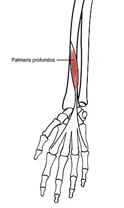 Palmaris profundus (also known as musculus comitans nervi mediani[1] or palmaris bitendinous[2]) is a rare anatomical variant in the anterior compartment of forearm. It was first described in 1908.[3] It is usually found incidentally in cadaveric dissection or surgery.