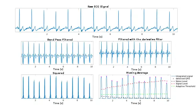 The Pan–Tompkins algorithm[1] is commonly used to detect QRS complexes in electrocardiographic signals (ECG). The QRS complex represents the ventricular depolarization and the main spike visible in an ECG signal (see figure). This feature makes it particularly suitable for measuring heart rate, the first way to assess the heart health state. In the first derivation of Einthoven of a physiological heart, the QRS complex is composed by a downward deflection (Q wave), a high upward deflection (R wave) and a final downward deflection (S wave).