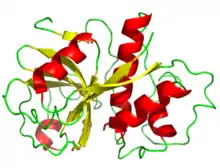 Papain belongs to a family of related proteins, known as the papain-like protease family, with a wide variety of activities, including endopeptidases, aminopeptidases, dipeptidyl peptidases and enzymes with both exo- and endopeptidase activity.[2] Members of the papain family are widespread, found in baculoviruses,[3] eubacteria, yeast, and practically all protozoa, plants and mammals.[2] The proteins are typically lysosomal or secreted, and proteolytic cleavage of the propeptide is required for enzyme activation, although bleomycin hydrolase is cytosolic in fungi and mammals.[4] Papain-like cysteine proteinases are essentially synthesised as inactive proenzymes (zymogens) with N-terminal propeptide regions. The activation process of these enzymes includes the removal of propeptide regions, which serve a variety of functions in vivo and in vitro. The pro-region is required for the proper folding of the newly synthesised enzyme, the inactivation of the peptidase domain and stabilisation of the enzyme against denaturing at neutral to alkaline pH conditions. Amino acid residues within the pro-region mediate their membrane association, and play a role in the transport of the proenzyme to lysosomes. Among the most notable features of propeptides is their ability to inhibit the activity of their cognate enzymes and that certain propeptides exhibit high selectivity for inhibition of the peptidases from which they originate.[5]