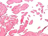 | Low magnification micrograph of an excised aortic valve papillary fibroelastoma showing the characteristic avascular branching papillae, H&E stain | |