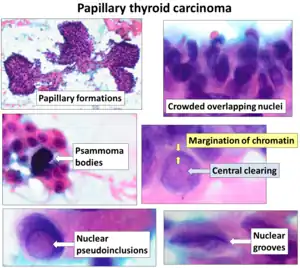 • Characteristic Orphan Annie eye nuclear clearings (nuclei with uniform staining, which appear empty due to powdery chromatin and marginal micronucleoli)[12] and psammoma bodies on light microscopy. The former is useful in identifying the follicular variant of papillary thyroid carcinomas.[13]