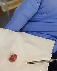 A papilloma (plural papillomas or papillomata) (papillo- + -oma) is a benign epithelial tumor[1] growing exophytically (outwardly projecting) in nipple-like and often finger-like fronds. In this context, papilla refers to the projection created by the tumor, not a tumor on an already existing papilla (such as the nipple).