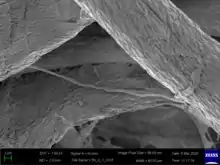 | A scanning electron micrograph of Paraburkholderia elongata cells in filamentous form grown in full strength tryptic soy broth and displayed against a backdrop of cellulose fibres | |