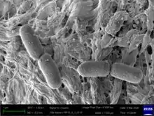 | A scanning electron micrograph of two replicating cells of Paraburkholderia madseniana RP11 against a backdrop of cellulose fibers | |