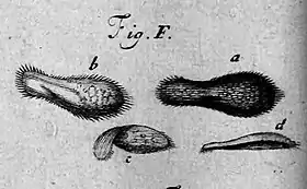 Paramecia were among the first ciliates to be observed by microscopists, in the late 17th century. They were probably known to the Dutch pioneer of protozoology, Antonie van Leeuwenhoek, and were clearly described by his contemporary Christiaan Huygens in a letter from 1678.[3] The earliest known illustration of a Paramecium species was published anonymously in Philosophical Transactions of the Royal Society in 1703.[4]