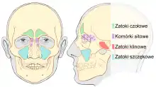 People with early stage nasal cavity or paranasal sinus cancer often do not show any symptoms, therefore, these types of cancer are usually diagnosed in the later stages. Nasal cavity or paranasal sinus cancer is often discovered when a person is being treated for a seemingly benign, inflammatory disease of the sinuses, such as sinusitis.[4] The signs and symptoms of later stage cancer are generally caused by the spread of malignant cells into the neighbouring structures of the paranasal sinus and nasal cavity.[5] There are often no obvious signs and symptoms before tumor cells spread into bone tissue. During the progress of the cancer, the overall signs and symptoms may include sinus pressure and pain, blocked sinus, headaches, nosebleeds, pain and pressure in the ears, among other symptoms.[1] Different symptoms may appear as the tumor starts to spread into other body structures. Symptoms such as proptosis, diplopia and other eye problems may appear if the tumor spreads into the orbit.[5] Symptoms such as trismus (lockjaw), facial swelling, toothache, mid-face or jaw numbness may occur if the tumor spreads into the infratemporal fossa, pterygopalatine fossae or masseteric space.[5] The spread of the cancer into the cranial cavity may lead to headaches, nerve damage, and cerebrospinal fluid leak.