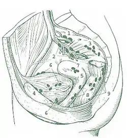 The pararectal lymph nodes are located on the left and right of the rectum.[1] Their efferent lymph ducts pass to the pre-aortic lymph nodes.